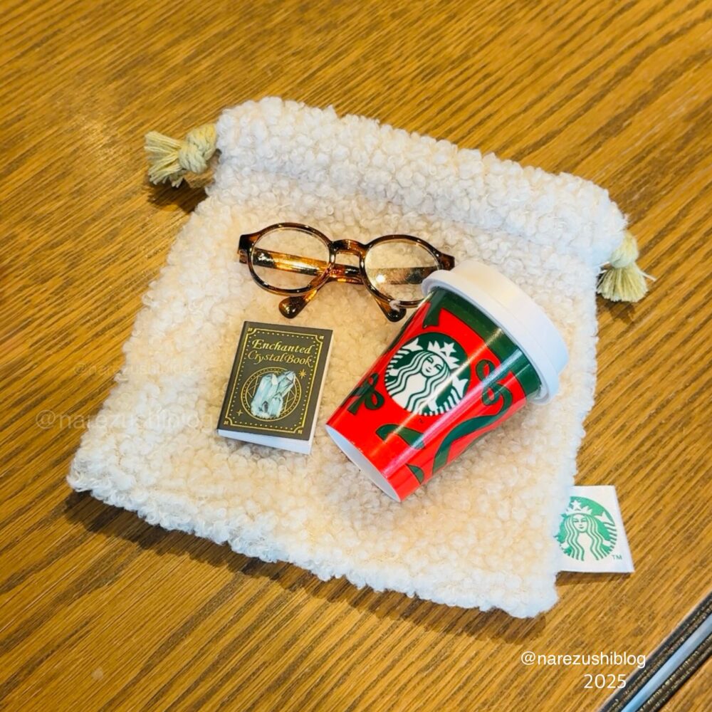 先日ゲットしたクリスマスなミニカップ、メガネ、本を巾着に入れてアディココもお出かけの準備。